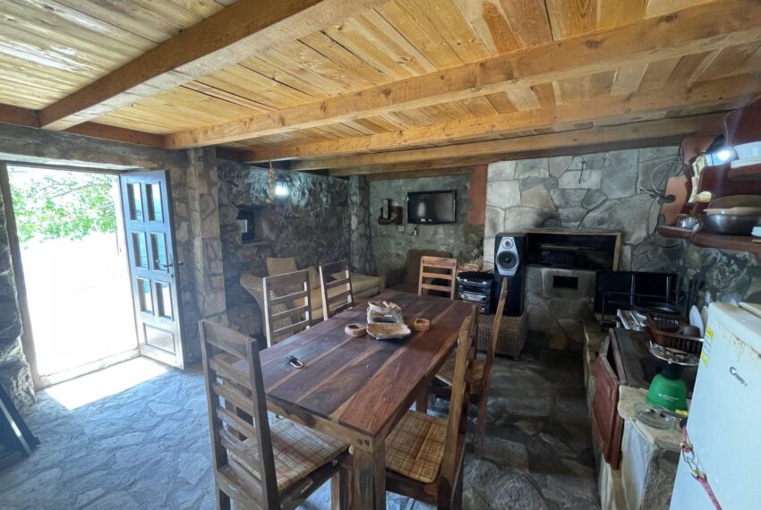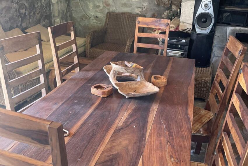 Kuća je opremljena ručno izrađenim namještajem, tikovinom, ugrađenim kaminom sa mogućnošću spremanja nacionalnih jela pod sačem. Unutrašnjost kuće je od ručno klesanog kamena.